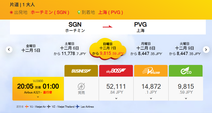 今回わたしが予約していたのは、ホーチミン(SGN)→上海・浦東(PVG)行きの便。